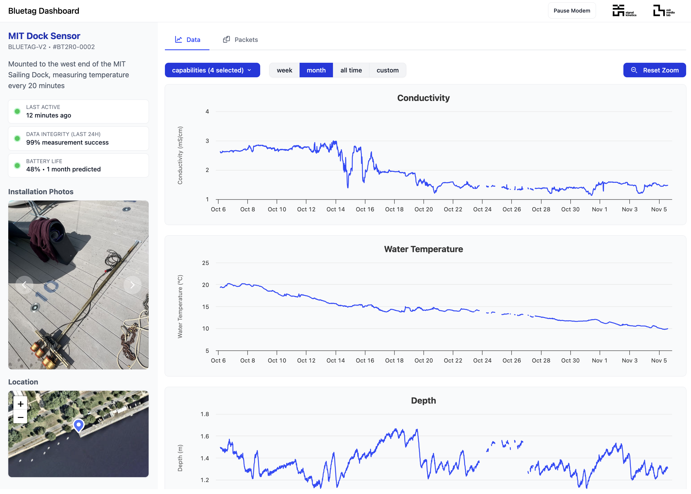 Until now, underwater backscatter systems have been limited to short-term laboratory experiments. BlueTag is the first underwater backscatter device to be deployed long enough to sense meaningful environmental data (since July 9th, 2025).
