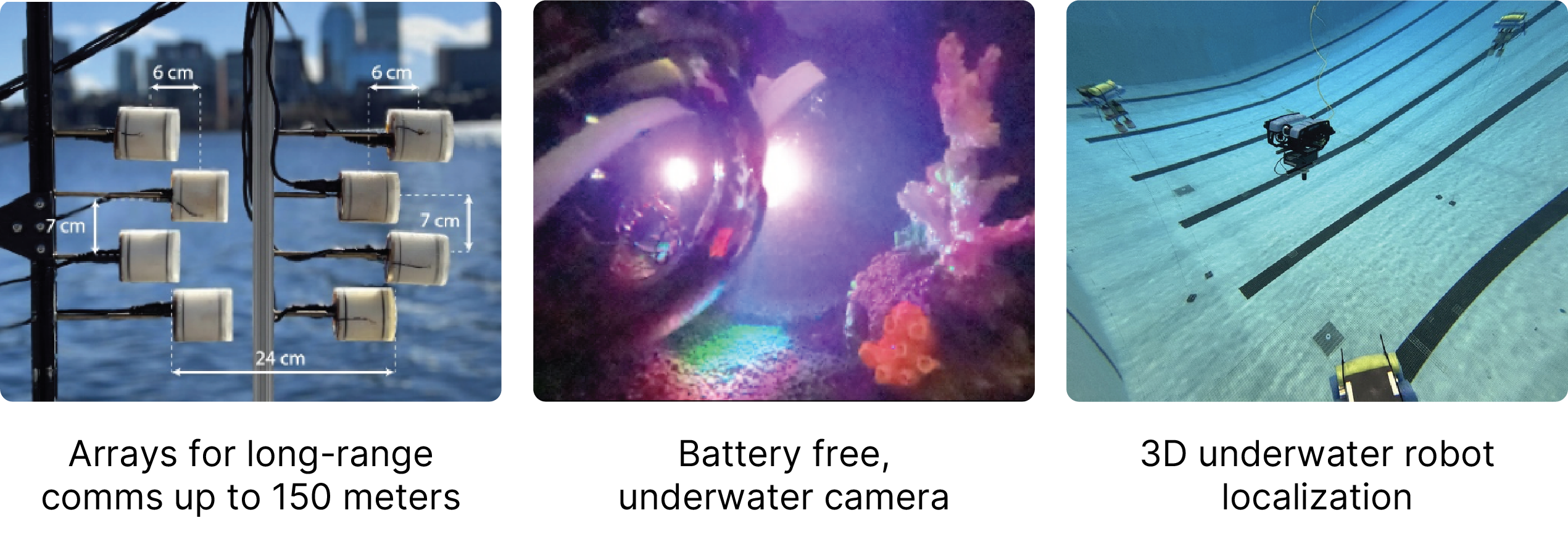 This technique was developed at our lab in 2019, and we’ve been working on pushing what’s possible with underwater backscatter since. We’ve extended the range with arrays of backscatter elements up to 150 meters. Using the communication method, we’ve developed a battery-free underwater camera and 3D underwater localization.