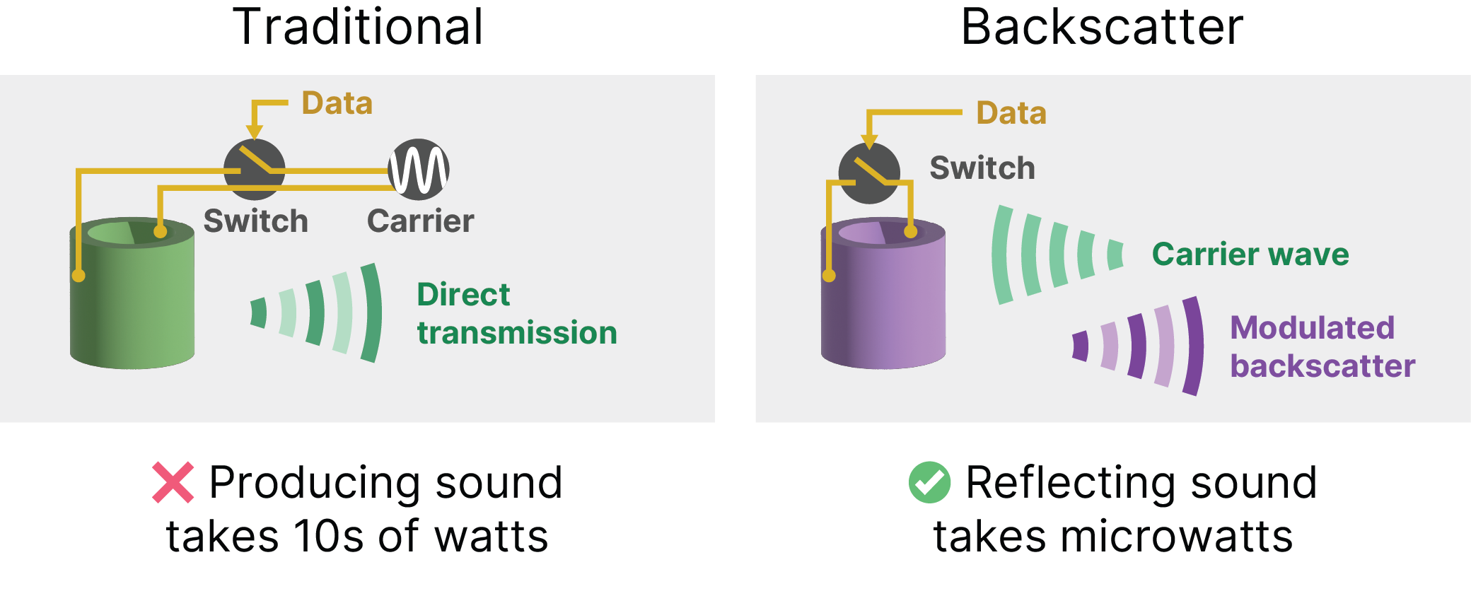 Using a technique called backscatter, we’re able to communicate using about 1 million times less energy on the sensor, enabling a whole new set of applications. Instead of transmitting all that acoustic energy directly, backscatter works by modulating the reflection or absorption of sound from another source.